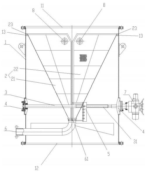 包括圓柱形殼體,殼體上端為進水口,下端為出水口;殼體上部的內(nèi)壁固設(shè)有一圈承接環(huán);殼體下部設(shè)有一個導(dǎo)出管,導(dǎo)出管的一端為進球口,進球口與殼體同軸;殼體內(nèi)設(shè)有一個圓錐臺型的收球網(wǎng),收球網(wǎng)由對稱設(shè)置的固定半網(wǎng)和移動半網(wǎng)組成,固定半網(wǎng)和移動半網(wǎng)的上端均設(shè)有架設(shè)在上述承接環(huán)上的支承環(huán),固定半網(wǎng)和移動半網(wǎng)的下端均與上述進球口相通,固定半網(wǎng)和移動半網(wǎng)的上部分別通過對稱設(shè)置的支撐軸支撐連接在殼體上;其中移動半網(wǎng)是鉸接在對稱設(shè)置的支撐軸上,固定半網(wǎng)與其對應(yīng)的對稱設(shè)置的支撐軸固連,并且固定半網(wǎng)的下端與導(dǎo)出管的進球口固連;一根絲桿穿過收球網(wǎng)并且絲桿以軸承架設(shè)在殼體上,絲桿上設(shè)有螺紋,一個導(dǎo)向滑塊螺設(shè)在絲桿上并且導(dǎo)向滑塊固連在移動半網(wǎng)上;絲桿位于殼體外的部分連接由電機和減速器構(gòu)成的電動執(zhí)行器;殼體上設(shè)有壓差傳感器,壓差傳感器與控制器電連接,控制器與電動執(zhí)行器電連接。