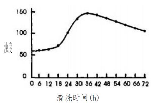 由圖1可知,加入GR-958后,循環(huán)水濁度開始增加。清洗到18h后,濁度呈快速增加趨勢,說明粘泥中的微生物在GR-958作用下失去活性,污泥粘性下降,開始大量分散進入水中。清洗到36h時,濁度從開始時的62mg/L增加到156mg/L,40h后,濁度開始緩慢下降,系統(tǒng)生物粘泥基本洗凈。