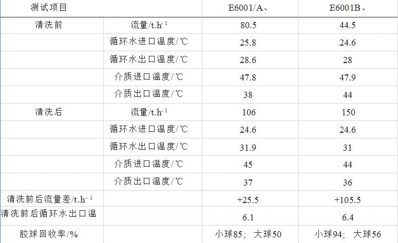 3.1此次清洗先使用Φ18mm膠球,后使用Φ20mm膠球分兩次對(duì)E6001/B、A進(jìn)行清洗,E6001/B小球的回收率為94%(投放膠球210個(gè),回收197只)。從現(xiàn)場目測(cè)的效果看,E6001/B組的循環(huán)水管線結(jié)垢多,清洗出的懸浮物濃度高,水質(zhì)差;E6001/A循環(huán)水中的懸浮物稍少于E6001/B,其循環(huán)水質(zhì)較混。