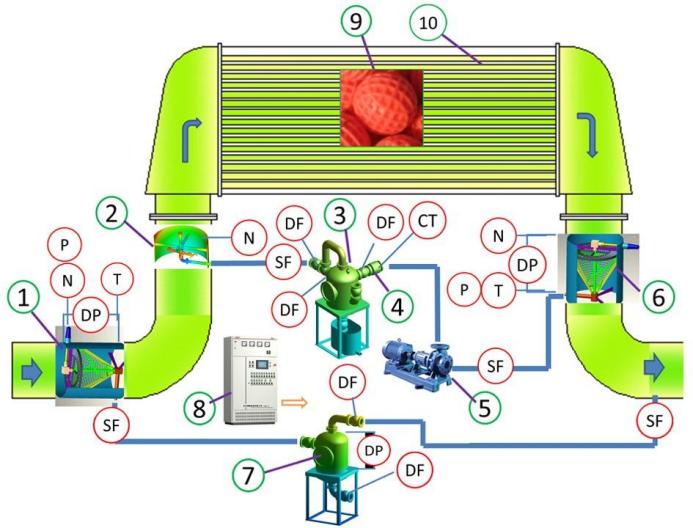 CT:計數;P:壓力測量;DP:壓差測量;DF:電控球閥;SF:手動球閥;N:旋轉測量;T:溫度測量;①旋轉自清潔二次濾網;②自旋轉均布投球器;③免開蓋裝球室;④膠球計數器;⑤膠球泵;⑥旋轉自清潔收球網;⑦反沖洗自潔雜物過濾器;⑧全功能測控柜;