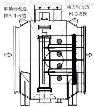 本次改造分為2部分:一部分對(duì)二次濾網(wǎng)傳動(dòng)部件進(jìn)行改造,包含排污斗短軸、聯(lián)軸器、動(dòng)力軸,從而避免二次濾網(wǎng)斷軸事故發(fā)生;二部分是對(duì)二次濾網(wǎng)網(wǎng)芯進(jìn)行改造,即對(duì)二次濾網(wǎng)的通流面積改造。具體改造方案如下。