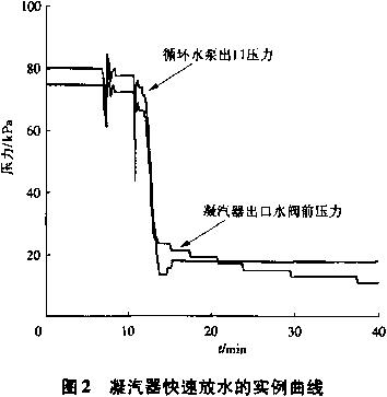 凝汽器快速放水的缺點是:可能會產(chǎn)生循環(huán)水泵倒轉(zhuǎn)的情況,由于循環(huán)水泵葉輪一般是采用套裝的軸套,上有絲扣擰在軸上,擰的方向與軸轉(zhuǎn)動方向相反。所以,當泵順轉(zhuǎn)時,就愈擰愈緊,如果反轉(zhuǎn)就容易使軸套退出,葉輪松動會產(chǎn)生摩擦。另外,循環(huán)水泵葉輪兩側(cè)的軋?zhí)m填料也存在同樣情況,反轉(zhuǎn)可能會使填料松動,漏水。單位3套S109FA機組循環(huán)水系統(tǒng)多次試驗中快速放水時,在沒有釆用限流措施的情況下(凝汽器水側(cè)自動透氣閥全開,循環(huán)水泵的出口液控蝶閥全開),現(xiàn)場也未見循環(huán)水泵倒轉(zhuǎn)。再例:由于凝汽器兩側(cè)出水閥關(guān)閉不嚴,按正常方式放水,整整24h,也未將水放盡,后通過凝汽器快速放水法,15min解決問題。所以,當采用限流措施快速放水時,應(yīng)該更安全,只要確保凝汽器兩側(cè)出水閥可靠關(guān)閉即可,實際快速放水實例曲線如圖2所示。