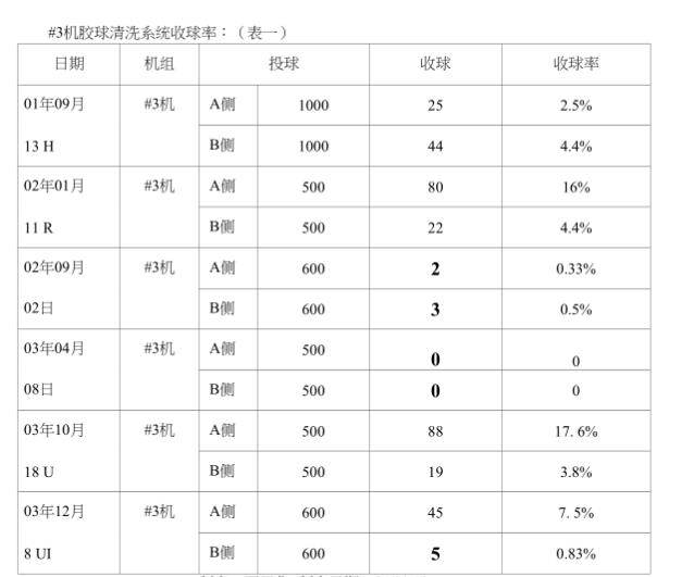 1#3機膠球清洗裝置系統收球率情況調查:我們小組把我廠2001一2003年度#3機膠球清洗裝置系統投、收球情況全部進行了核查,發現收球率實在太低,有時加人幾百個球其至連-個球都收不到,現摘錄其中兒次投、收球數據,以供大家了解我廠“收球率。
