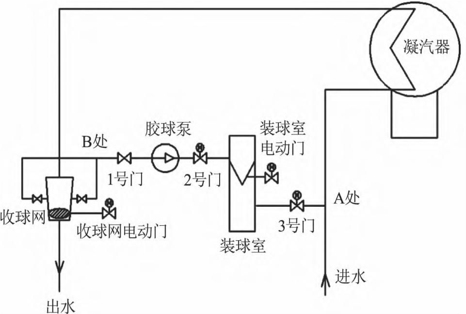 膠球清洗裝置系統如圖1所示,膠球清洗過程可分為三個階段:(1)膠球通過膠球泵打入至凝汽器循環水進水管的階段;(2)膠球通過凝汽器z管的清洗階段;(3)膠球被循環水帶至凝汽器循環水出水管的階段。